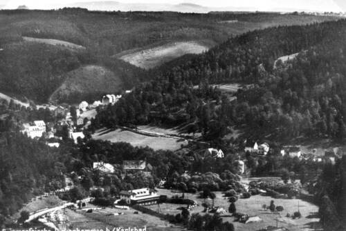 Mitte links die Marienkirche, darüber ein Teil vom Katzenwinkel und Mutterlohweg. Vorn links die Schießstätte und die Schützenmühle, rechts ein Teil der Boxburg.