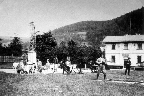 Schießstätte der Karlsbader Schützenfreunde in Pirkenhammer. Preisschießen am Tontaubenstand.