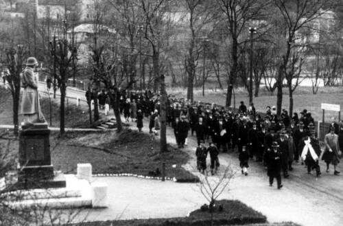 Zur Erinnerung an den im Jahre 1931 gegründeten Verein "Heimatsöhne im Weltkrieg" marschierte die Ortsgruppe zum Krieger-Denkmal und legte einen Kranz nieder.