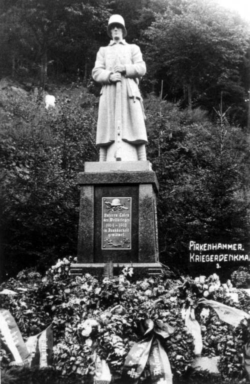 Das Kriegerdenkmal in Pirkenhammer für die Gefallenen und Vermißten vom 1. Weltkrieg 1914-18 nach seiner Enthüllung am 23. August 1936. Nach der Vertreibung von den Tschechen zerstört.