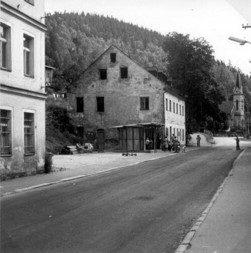 Links Haus 51 Schäfer-Kaufmann, rechts Haus 85 Sommer, früher Laden von Frau Günther, dazwischen fehlt Haus 84 Fam.Harzer.