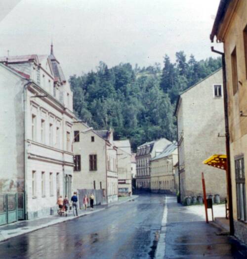 Links Haus 105 Uhrmacher Ullmann, 104 Gemeindeamt, 135 Kino Franz Ullmann, rechts 85 Sommer, 84 Harzer fehlt, 51 Schäfer-Kaufmann, hinten sieht man noch Morgenstern und Fleischer Lill.