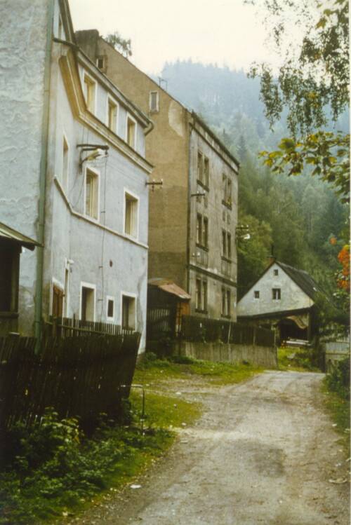 Links 61 Kokotek-Haus, Lücke Franz Zeischka Nr. 60, Haus 62 Julius Grund, Nr. 63 Nesswetha fehlt, rechts Nr. 76 Laura Hauptmann.