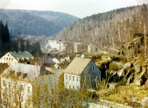 ;Links die Volksschule, rechts Haus 14 Mayer, Lydia/Klein, Olga. hinten links Gasthaus Sonne und unterer Hammer.